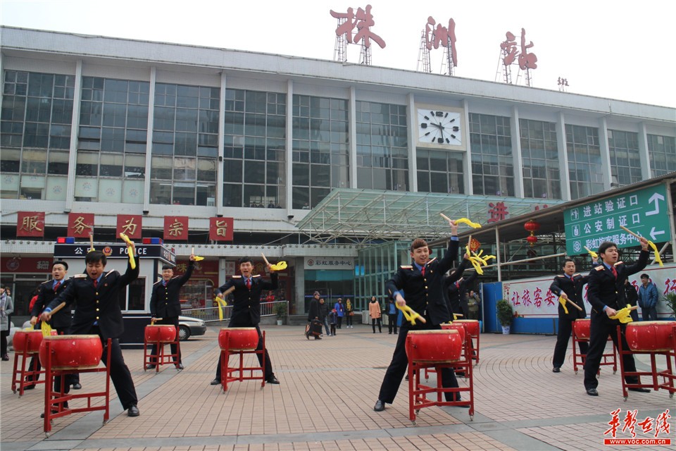 2月4日,株洲火车站客运工作人员在站前广场上击鼓奏乐。