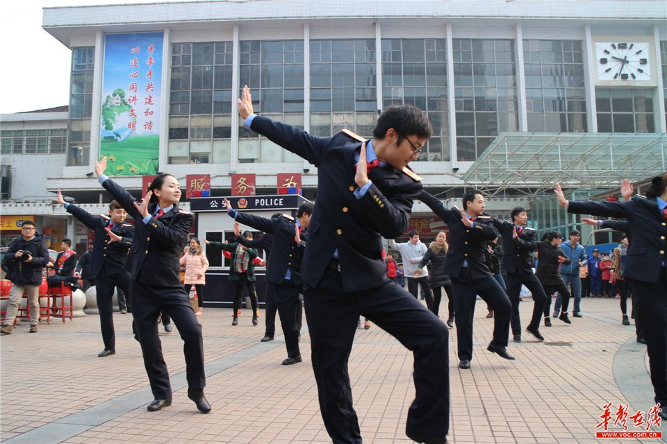 2月4日,春运第一天,株洲火车站客运工作人员在站前广场上跳起了“小苹果”。