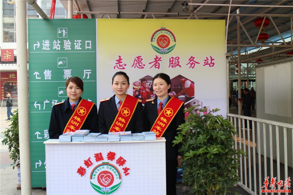 火车站客运工作人员在表演结束后为旅客分发“旅客购票服务指南”。