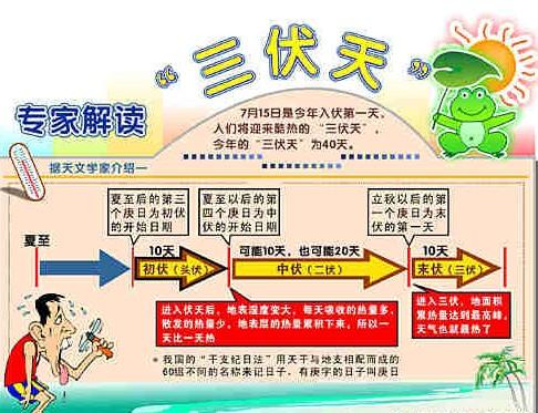 首先大家要搞清楚什么是三伏,三伏是一年中最闷、最热的三、四十天,三伏是按农历计算的,是指初伏、中伏、末伏三个庚日,具体日期是按照我国古代的干支法来推算的,以我国农历24节气中夏至后的第三个庚日为初伏,第四个庚日为中伏,立秋后第一个庚日为末伏,大约处在阳历的7月中旬至8月下旬,农历历书上都有标注。