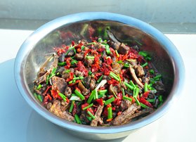 茶陵伏狗是极具特色的中国南方汉民族美食,茶陵伏狗用料为茶陵乡下优质肉食土狗,选狗也是很讲究的,选材品质等级依次为“一黄二白三花四黑”,食材要选择六个月大的公黄狗为最佳,接下来是杀狗褪毛,狗血是要留着备用的,宰杀洗净后,点燃稻草慢火熏狗,直至狗表皮金黄澄亮,然后开膛破肚。狗肺就不要了,“狼心狗肺”嘛!其余的均可食之,尤其是狗肠,有道是:“恰狗不恰肠,等于没有尝”。切狗肉时刀功很重要,要做到刀刀入扣,点点带皮。