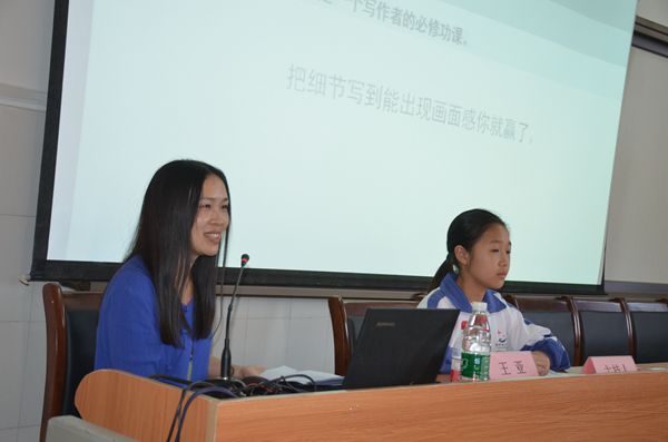 在一个多小时的讲座中,王亚老师针对中学生的阅读与写作实际,结合她本人多年的高中语文教学实践和阅读写作的经历,列举了许多生动典型的事例,就中学生为什么要坚持文学阅读,要读怎样的书以及怎样进行文学创作等话题进行了很好的指导。王老师在讲座中告诉我们:阅读只是一种生活方式。第一等不可功利的是阅读;不要做“有知识没文化”的“读书人”;要把阅读变成自己的一种生活习惯;关注经典、关注当下、关注内心,多读点所谓“无用之书”。其实,写作没有那么神秘。没有凭空而至的灵感,它永远来源于积累。好的文章大多胜在细节,保有内心的诗意,要写与别人不一样的文字。这些发自肺腑的读书感悟和写作指导,对田心中学花季文学社成员和校园记者们都有好的启发。在讲座中,王亚老师还与花季文学社的同学以及校园记者们进行了互动交流。王亚老师亲切生动的讲座得到了现场师生的热烈欢迎!