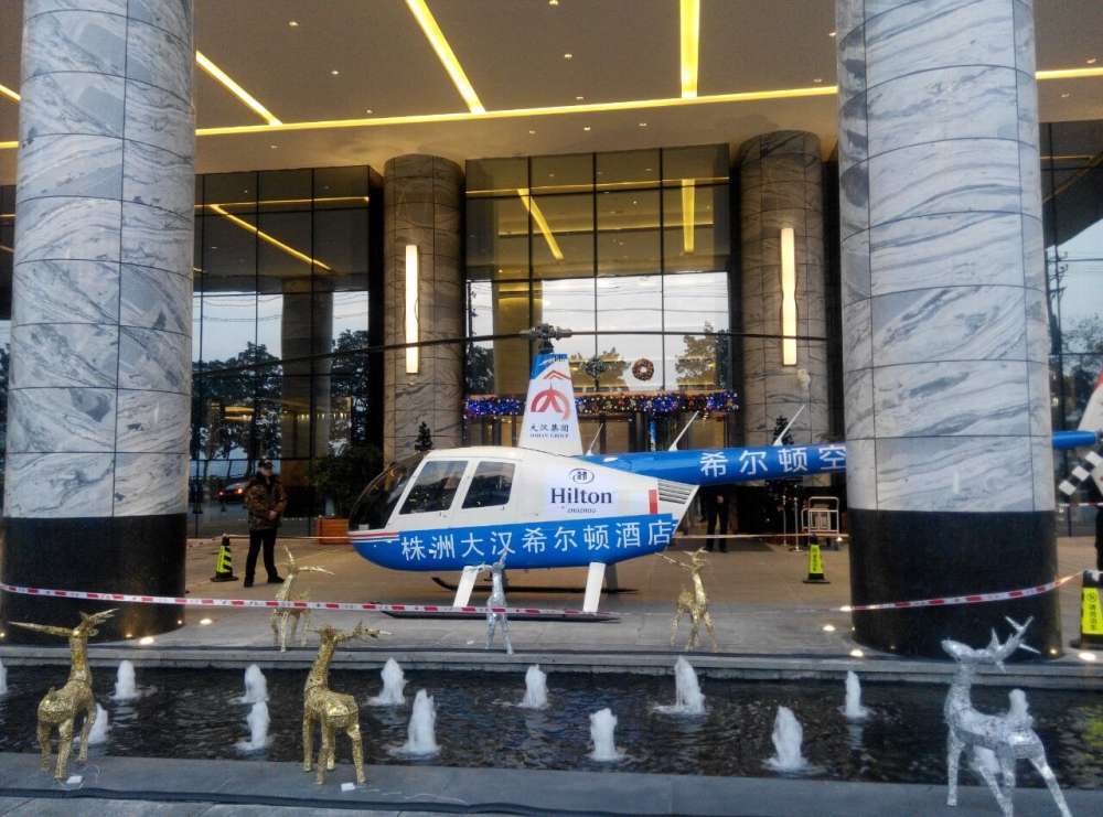 三湘华声株洲分站讯 12月22日,湖南省首家希尔顿全球酒店株洲大汉希尔顿酒店正式开业,这是中国第32家希尔顿品牌酒店。其中,希尔顿酒店大楼高158米,是株洲第一高楼,楼宇共36层,7-20层为写字楼,21-36层为希尔顿酒店客房,在楼顶配建有直升机停机坪,方便尊贵客人直接从楼顶进入酒店。 开业当日,作为酒店方VIP客户通勤服务合作商的湖南翔为通用航空有限公司派出2架罗宾逊R44Ⅱ型直升机全程祝庆。