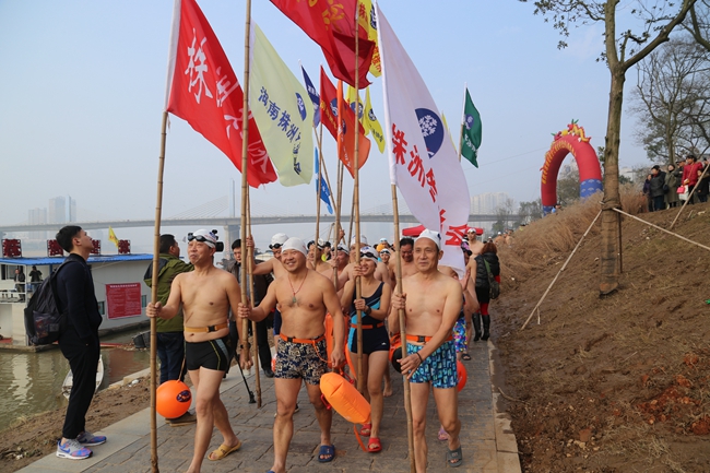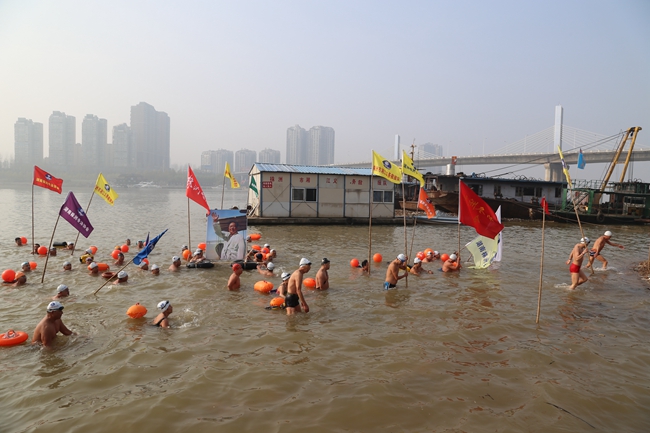 三湘华声株洲分站12月26日讯,今天下午2点30分,株洲市130多名冬泳爱好者在湘江东岸天元大桥上游畅游湘江,以此纪念毛泽东诞辰122周年。