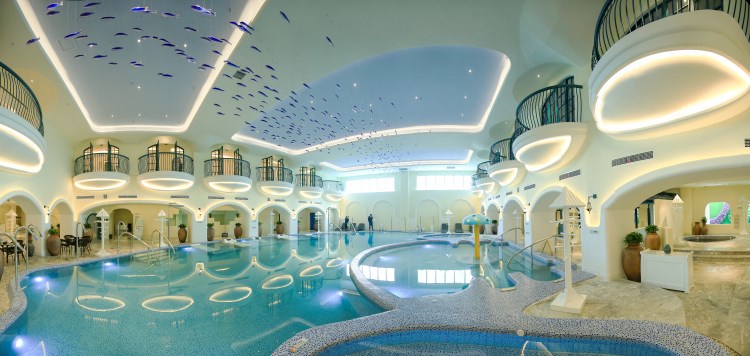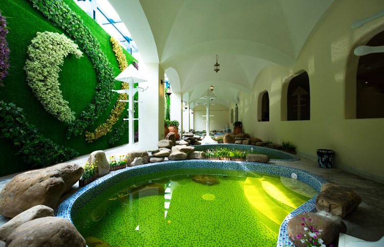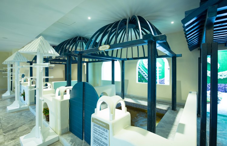据云龙水上乐园水疗馆陈总向大家介绍:本馆采用地中海风格装修,营业面积有6千平米,本馆位于株洲云龙示范区华强路东侧,南面为已建水上乐园大门和接待中心,东面为水上乐园游乐设施,北面为水上乐园水渠及停车场,水疗馆分布于一、二楼及夹层,共设有21种不同功能的泡池,分别为水疗功能池、儿童池、中药泡池、七仙(现为硫磺)池、土耳其浴、死海浴(单独收费)、鱼疗池浴(单独收费)及五种特色干蒸房。更衣柜总数520个(男女比例为1:1),一位大人可免费带1.2米以下小孩洗浴和自助餐。