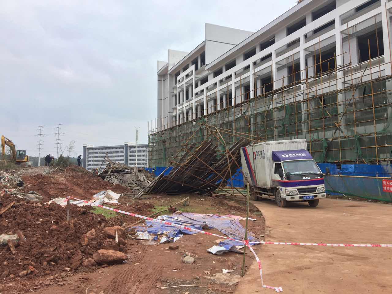 “脚手架塌了,几个同学受了伤,已经送医院了,”一位同学介绍,由于新校区正在建设期,该便道是连接宿舍区与教学区的重要通道,因距离主干道较近,接送学生的校车、快递车、小车等均从此处进出。施工方才特地搭建脚手架,防止高空坠物伤人。