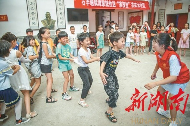 7月13日,攸县石羊塘镇谭家垅社区,大学生志愿者和孩子们一起玩游戏。